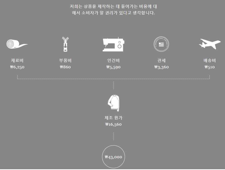 단순히 True Cost만을 강조하였더라면, 약간의 의심이 있었을 것입니다. 높은 품질의 제품을 합리적인 가격에 판매하고 있다는 것을 보여주기 위해 원가와 판매가격을 보여주고 있는데, 제 생각에는 '아 그 로스들을 인건비나 재료비에서 후려치는거 아니야?'라는 생각도 처음엔 들었습니다.